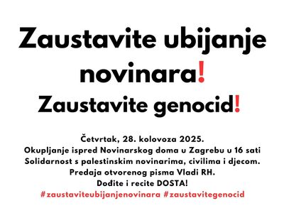 Sindikat novinara Hrvatske uputio je poziv sindikatima u Hrvatskoj da se pridruže sutra, u četvrtak, u 16 sati prosvjednoj šetnji od Novinarskog doma do Zrinjevca u sklopu skupa "Zaustavite ubijanje civila! Zaustavite ubijanje novinara!" SNH prosvjed organizira zajedno s Hrvatskim novinarskim društvom.